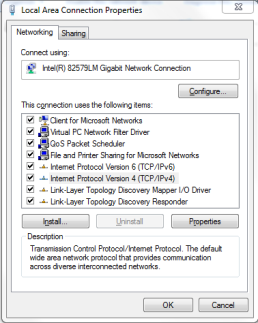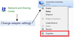 In Windows Vista and Windows 7, open the Network and Sharing Center menu within Control Panel. Click “Change adapter settings”. This will bring up a list of network connections, including active and inactive ones. Right click on the name of the network to which the Color SDS Data Logger is or will be connected, and then click Properties.
