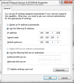 In the Internet Protocol Version 4 (TCP/IPv4) Properties window, you will need to select the option for Use The Following IP Address.  These settings should match the settings on the Color SDS Data Logger.