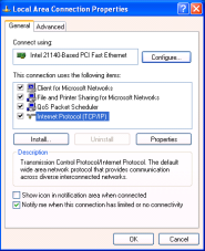 Once the Local Area Connection Properties screen is displayed, the Local Area Connection Properties tab should be highlighted.  Click on Internet Protocol (TCP/IP) and then click the Properties button to display Internet Protocol (TCP/IP) Properties.