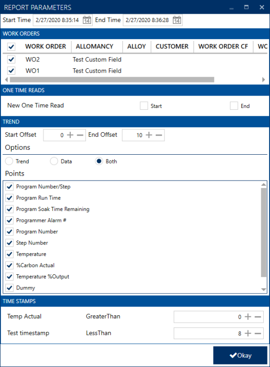 The Edit buttons will bring up the Report Parameters screen which allows you to deselect Work Orders. Also, here you can set Trend, Data, or Both for each specific report.