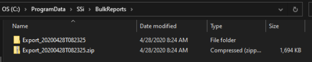 Windows Explorer will open to the BulkReports directory where you can find the export folder and also a zip of that folder. The export folder is named with the full data and time of when the reports were generated.