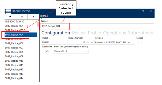 The Details Panel includes the Configuration, Recipe, Profile, Operations, and Subroutines Tabs.