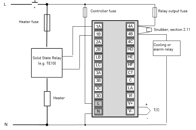 This example shows a standard (non FM) 808 series heat/cool temperature controller where the heater control uses a SSR, triggered by a logic output on OP1, and the cooling control uses the relay, OP4.