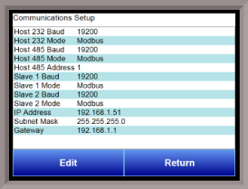 To change the IP Address, Subnet Mask, or Gateway, highlight the parameter that needs to be entered and press the Edit key to displays a numeric keypad that can be used to enter the required value.  Pressing the Return key returns you to the Configuration Menu.
