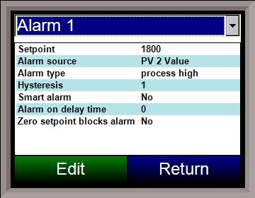 The 9120 controller can be configured to use three different alarms. Each of the alarms consists of an alarm setpoint, alarm source, alarm type, hysteresis, smart alarm, alarm on delay time, and a zero SP blocks alarm value. The alarms come from the factory with a default configuration dependent on the application but also can be modified prior to shipment to your facility or in the field by a supervisor. Alarm 0 is used to turn off an alarm and is not an alarm itself. Its function is the same as the Acknowledge button.