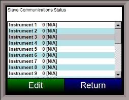 This page is a display of the current process variables of each of the Client instruments communicating with the 9120 controller. Note – None of these values can be modified on this screen. The Client instruments can be set up in the Instrument Assignments menu option. A [N/A] displayed means that the Client instrument has not been set up yet. A Bad means that communications are not functioning properly or that the instrument has been set up improperly. Note: Twenty-five (25) Client instrument statuses will be displayed on this screen.