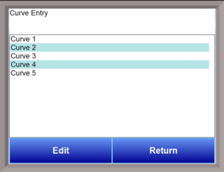 The first screen shows that five separate curves can be edited. Selecting one of Curve 1-5 and pressing Edit will display the screen where new curves can be assigned. The type can be toggled between Linear and None. |