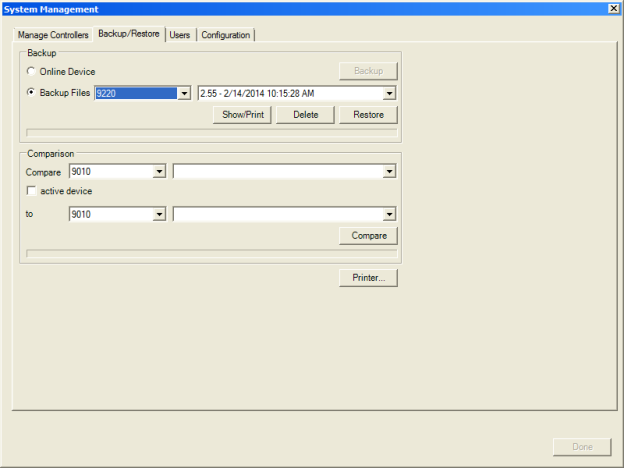 Note about ADAM module support: Communications with ADAM analog input modules manufactured by Advantech are not supported as of 9220 firmware revision 2.46. To determine the firmware version of your 9220 instrument, perform a controller data backup using the System Management -> Backup/Restore menu in Configurator. Select Backup -> Online Device. Once the backup is performed, check the Backup Files list for the 9220 as shown in the screen shot. The firmware revision level will be shown.