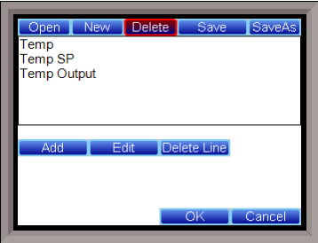 The buttons across the top of the screen – Open, New, Delete, Save, and Save As – deal with the trend chart files themselves, not the individual trend lines.