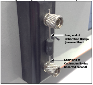 Connect the Calibration Bridge to the binding posts (It is not necessary to sand the calibration bridge). Do this by first inserting the long end of the Calibration Bridge into a binding post first, tightening that post, then inserting the short end of the Calibration Bridge in the other binding post, and tightening that post. See Figure 38.
