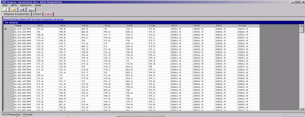 The Data Tab (Figure 78 - Data Tab) contains the data from each thermocouple for the each interval selected from the Load Survey Data screen (Figure 59 - Load Survey Data screen).