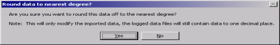 Clicking on the “Round this data off to the nearest degree” link will pop up a message box confirming the action (Figure 79 - Round data confirmation). The rounding only affects imported data. The data in the logged files will still contain data rounded to one decimal place. Clicking on the “Yes” button will round the data.