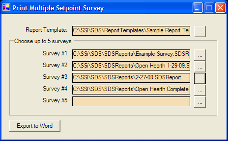 The Print Multiple Setpoint Survey screen will allow the user to select a report template that utilizes the multiple setpoint survey tags (described below) and up to 5 survey files (.SDSReport).