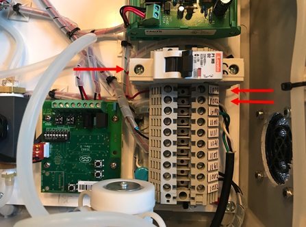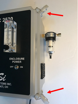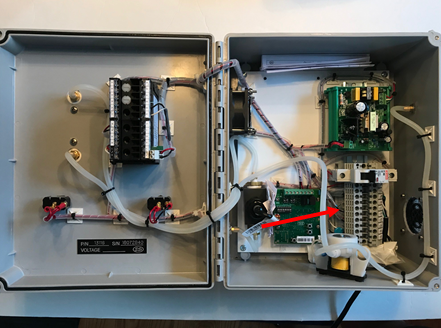 Verify that the unit has power. Open the case by releasing the latches on the top and bottom corners of the right side of the enclosure (Figure 8). Open the enclosure and locate the wiring terminal (Figure 9). With a voltmeter set to AC Voltage, Ṽ, verify that there is 110/120 VAC on terminals 1000 and 1002 (Figure 10). Wire 1000 is considered to be the “hot” wire and wire 1002 should be the neutral in the circuit.