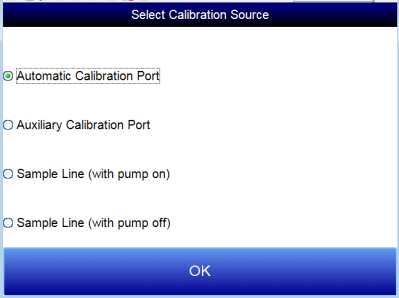 On the MGA 6010, you can perform a sensor calibration with one of four calibration sources. These sources are displayed when Sensor Calibration is first selected: Automatic Calibration Port, Auxiliary Calibration Port, Sample Line (with pump on), and Sample Line (with pump off).