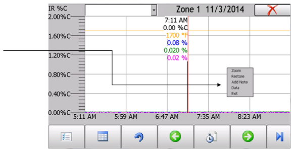 There is a sub-menu available by putting a finger or a stylus anywhere on the chart and holding it there for a couple of seconds. The sub-menu will have the following options available: Zoom, Restore, Add Note, Data, and Exit.