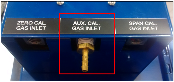 The Auxiliary Calibration Port makes use of the Auxiliary Calibration Gas Inlet, located on the side of the enclosure and in the middle of the gas inlets for Zero Calibration and Span Calibration. A single gas line is run to the Auxiliary Calibration Gas Inlet port for zero and span calibration.