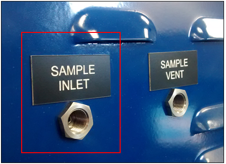 Calibration with a Sample Line makes use of the Sample Inlet Port located on the side of the enclosure opposite the ports used for Automatic Calibration and Auxiliary Calibration. The option selected will depend on whether the pump is running [Sample Line (with pump on)] or not running [Sample Line (with pump off)].