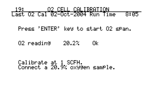 O2 Cell Calibration is used to calibrate the oxygen sensor. The oxygen sensor is calibrated using air (20.9% O2) as the reference. If the oxygen cell output is outside of a 30% band then the message REPLACE O2 CELL! will appear near the bottom of the screen. When calibrating the O2 sensor, no special gas is required, only fresh ambient air. It is better to perform this calibration in an office or outside to be sure that the process gas does not influence the ambient air. After the pump has been on for long enough for the readings to stabilize (approximately one minute), press the Enter key to begin the calibration process. A calibration complete message will appear when the calibration is finished.
