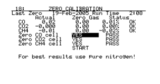 This page is used to zero the IR cells. It is very important to be sure that the sample gas is a good zero especially for CO2. Ambient air has nominal percentage of CO2, which should not be present when performing a zero calibration. It is recommended that 99.9% pure nitrogen be used for zeroing the PGA3500. If there is no nitrogen present, the CO2 Scrubber (P/N 13112) can be used to remove the CO2 from ambient air. The sample gas flow rate should be between 1 and 1.5 SCFH.