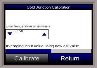 Note – The cold junction should be performed after any zero/span calibration. To perform a cold junction, the corresponding T/C wire will need to be setup on the inputs. A specific temperature will need to be sourced to the selected input. Return to the main screen by pressing the Return button three times to read the input’s PV value. Mark down the displayed PV value and determine the difference between the displayed PV value and the value that is being sourced.