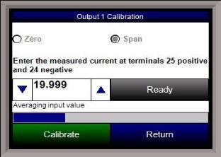 To perform a zero calibration on an output, verify that the “Span” option at the top is selected. Press the Ready button to begin the process. Enter the mA value that is being measured at the appropriate terminals (see the 9120 Wiring Terminals section; the appropriate terminals to measure will also be displayed on the screen). Press the Calibrate button to finish the calibration. The calibration status will be displayed on screen. When it is over, the screen will display “idle” once again.