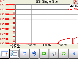 The Trend Chart Display shows between 1 hour and 24 hours of process variable data on the screen and can be scrolled back to view all of the data stored on the hard drive. The vertical timelines change as the time changes on the screen.
