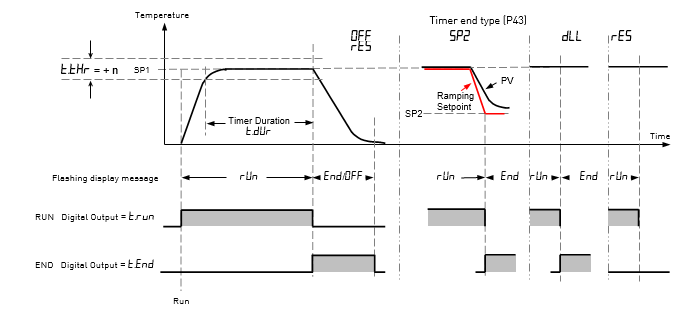 SP2: When the timer completes, the target setpoint will switch to setpoint 2. Setpoint 2 may be a lower or a higher temperature. If the Setpoint Rate Limit is enabled, then the controller will ramp to the setpoint 2 at the SPrr rate. During this ramp, the Timer status will indicate RUN. Once the setpoint 2 is reached the status will change to EnD. This configuration can be used to provide a simple ramp/dwell/ramp/dwell sequence.