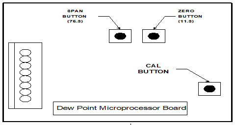 1.1 The microprocessor board contains three very small buttons that are used for calibration. Two are next to one another, and they are marked “75.3%” and “11.3%”, while the other has no label. The unmarked button is the “Calibrate” button. The approximate locations of each button are shown on this diagram (Figure 1):
