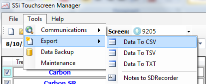 Export provides the option to save data as a .CSV, .TSV, or .TXT file. Also, notes from TS Manager can be exported to SDRecorder.