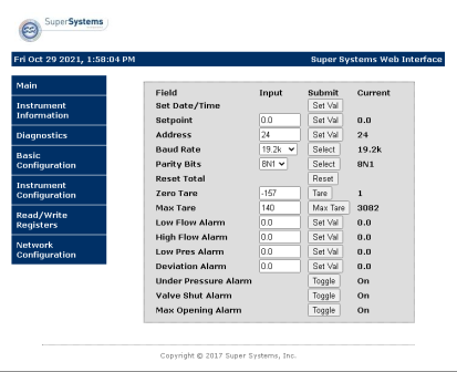 The Basic Configuration page displays current basic parameter values and provides the ability to set, select, and reset values. The parameters are described in more detail below.