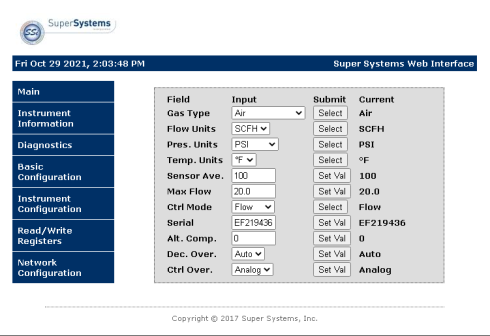 The Instrument Configuration page displays current parameter values and provides the ability to set, select, and reset values. The parameters are described in more detail below.